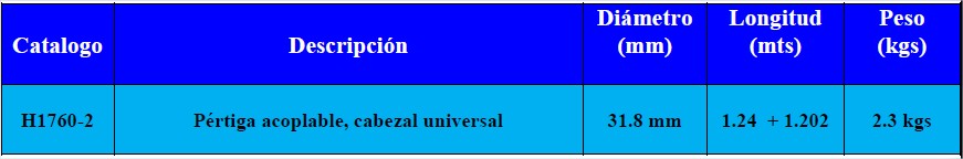 Pértiga acoplable para usar con Accesorios Universales Diseñadas para usarse como mango para los accesorios con acoples universales, las Pértigas Universales Chance están hechas de Epoxiglas® y piezas de aluminio fundido y de un peso liviano.