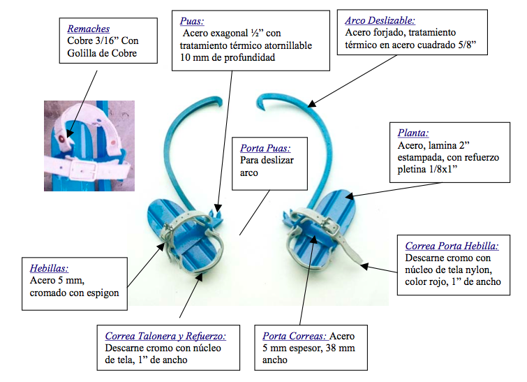 Arco regulable para postes de concreto, púas y correaje reemplazables, amarra al empeine y talón con correas reforzadas y alma roja de seguridad en su interior, cubiertas de cuero cromo, tratamiento térmico y pintura especial, Fab. MUNELEC.
